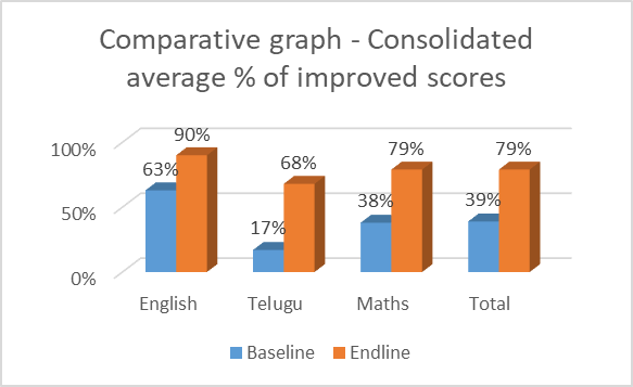 The program directly impacted around 655 children and allowed scope to improve their basics in core subjects. Learning curve was high in Telugu than other subjects followed by Maths. English letters and words awareness is better compared to other subjects among children. Overall attendance of the children attending Buniyaad program improved, as they do not want to miss the classes. Buniyaad teachers could achieve the set objectives to around 70% to 80%.
